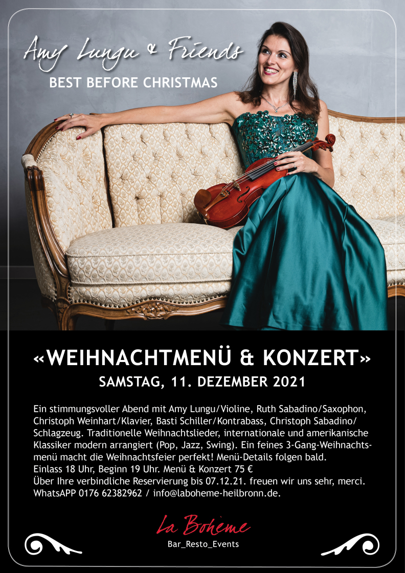 Ein besonderer Höhepunkt im Konzertjahr ist das beliebte Adventskonzert von Amy Lungu und ihrer Band. Wegen der großen Nachfrage findet dieses Konzert in der Vorweihnachtszeit an verschiedenen Spielstätten in der Region und auch überregional statt. Dabei ist das Konzert im Parkhotel Heilbronn wiederum etwas Besonderes, denn es steht in Verbindung mit einem hervorragenden Dinner. Die Plätze sind begrenzt – es lohnt sich eine frühe Reservierung.
